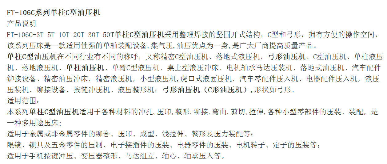 FT-103-20TC型落地式油压机 单臂液压冲床 弓型液压机